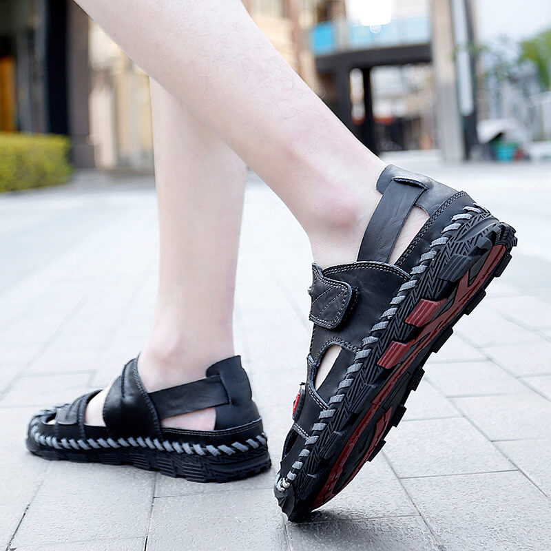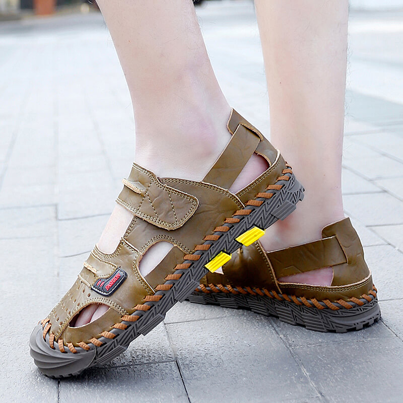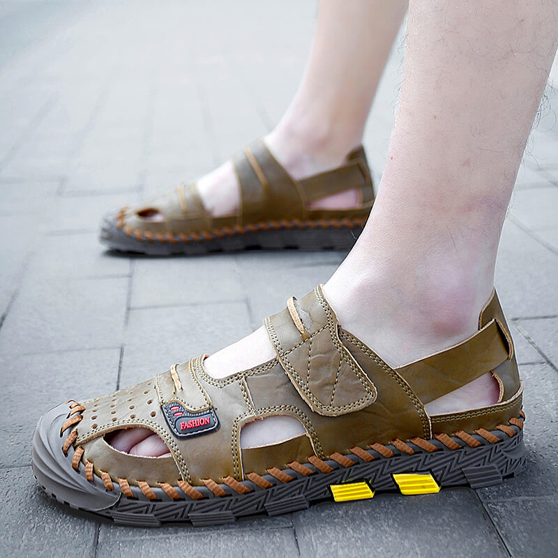 ★FRIENDLY:The mens sandals can be twisted,make you comfortable and relaxing.The closed toe design to a large extent protect you toe from hurt,and the button make the leather sandals easy to put on and take off.