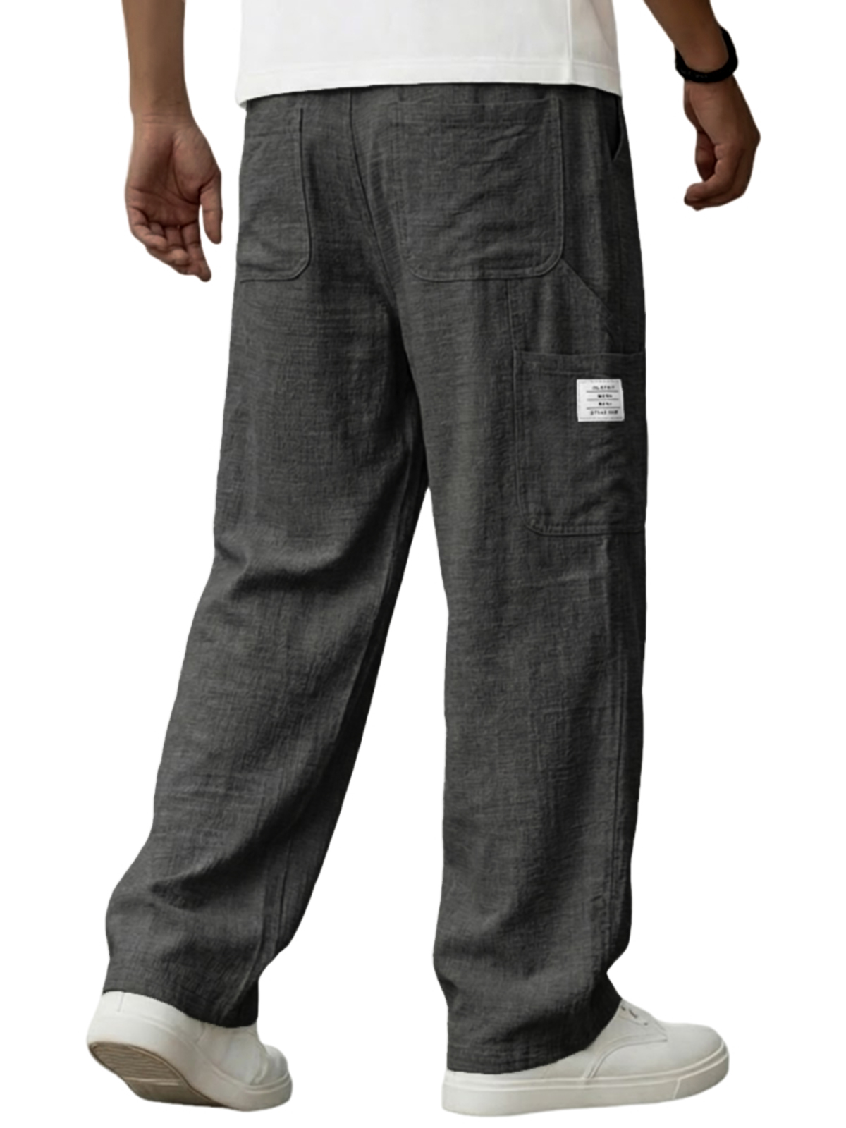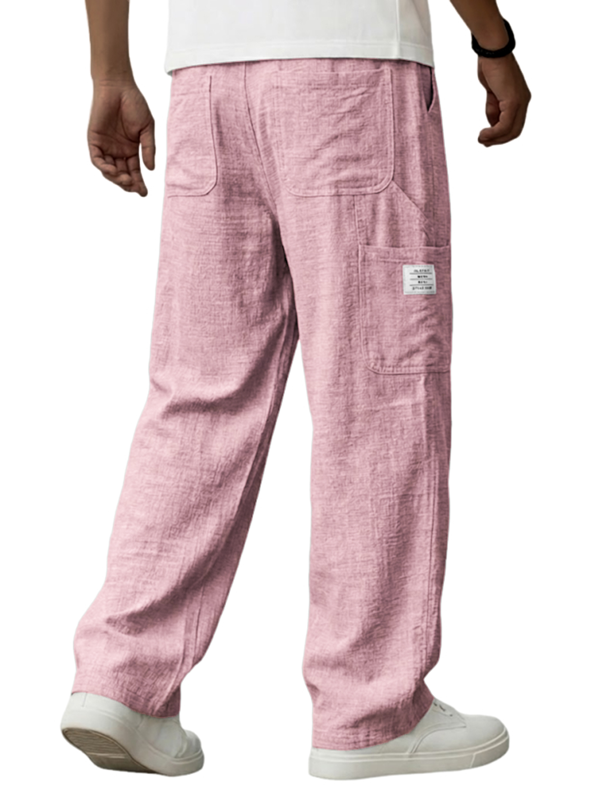 Men's Vintage Breathable Linen Multi-pocket Casual Embroidered Label Trousers